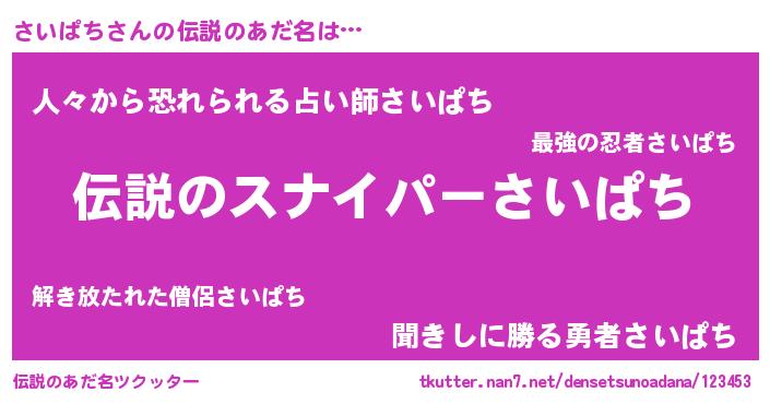 | 意味不明あだ名 | 『ペロリンさいぱち』『永久保存さいぱち』 |