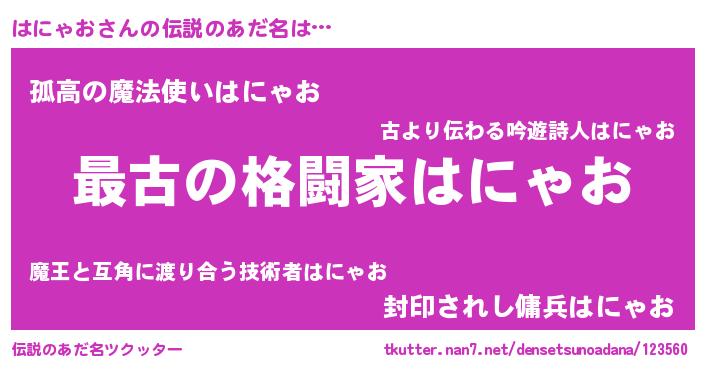 | 意味不明あだ名 | 『たけのこ科はにゃお属』『自称はにゃお』 |