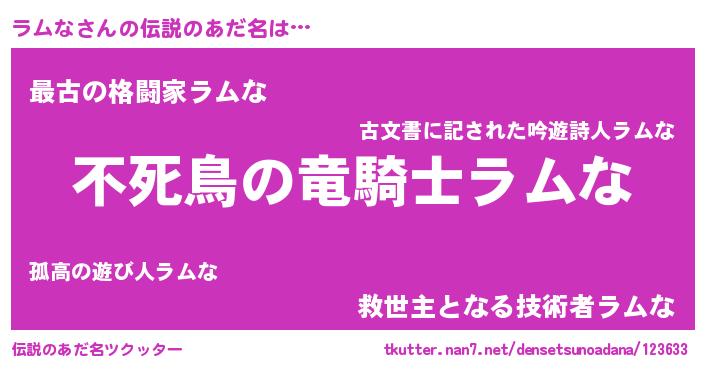 | 女子向けラノベタイトル風あだ名 | 『ラムな姫と円卓の騎士』 |