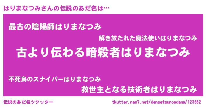 | 胡散臭い通販商品みたいなあだ名 | 『来世でも幸せになれる健康食品…その名も「はりまなつみ」』 |