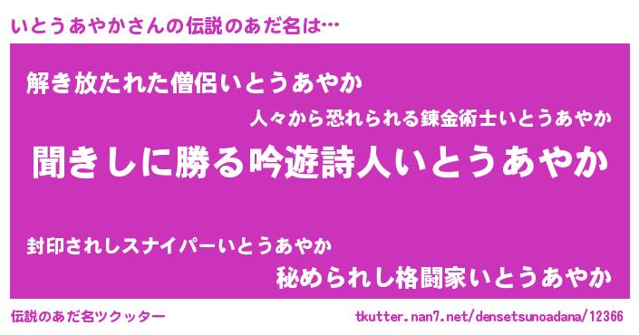 | 男性向けラノベタイトル風あだ名 | 『いとうあやかという概念が存在しない退屈な世界 』 |