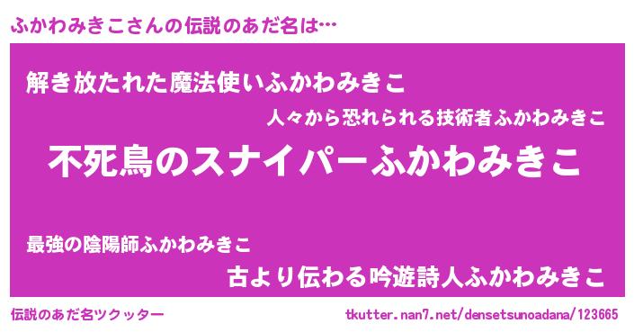 | ヒーロー風カッコイイあだ名 | 『スーパーフカワミキコ』『魔戒騎士フカ』 |
