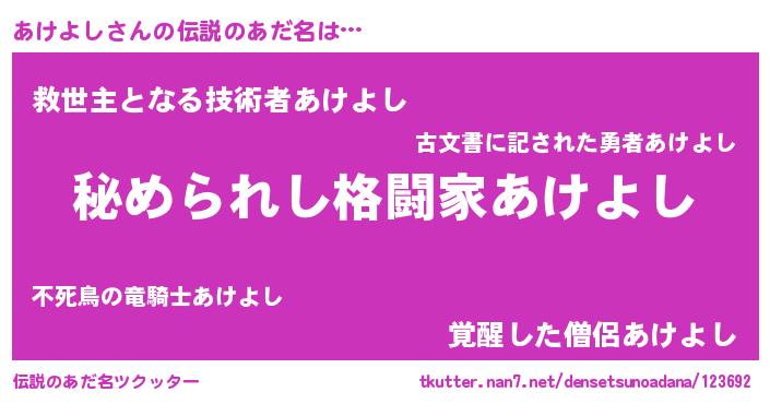 | ヒーロー風カッコイイあだ名 | 『ウルトラあけよしマン』『天弓騎士アケ』 |