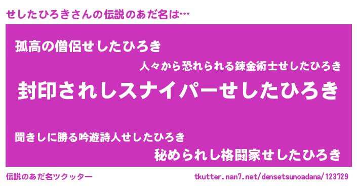 | 胡散臭い通販商品みたいなあだ名 | 『億万長者になれる霊験あらたかなお札…その名も「せしたひろき」』 |