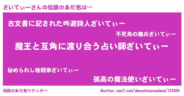 | ヒーロー風カッコイイあだ名 | 『慈愛の使者ざいてぃー』『幻影騎士ザイ』 |