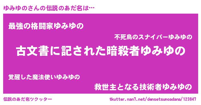 | ヒーロー風カッコイイあだ名 | 『ネオユミユノ』『ウルトラゆみゆのマン』 |