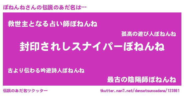 | 胡散臭い通販商品みたいなあだ名 | 『億万長者になれる霊験あらたかなお札…その名も「ぼねんね」』 |