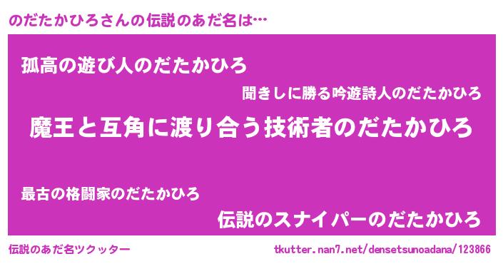 | 男性向けラノベタイトル風あだ名 | 『転生したらのだたかひろだった件』 |