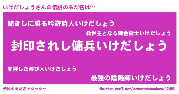 | 男性向けラノベタイトル風あだ名 | 『いけだしょう~年齢イコール彼女いない歴の魔法使い~』 |