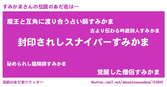 | 男性向けラノベタイトル風あだ名 | 『すみかま~年齢イコール彼女いない歴の魔法使い~』 |