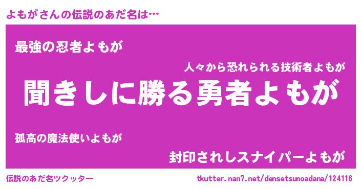 | 男性向けラノベタイトル風あだ名 | 『魔弾の王とよもが』『ヨモガスレイヤー』 |