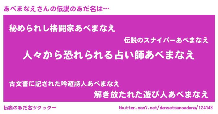 | 胡散臭い通販商品みたいなあだ名 | 『100人中100人が認めたイリジウム磁石…その名も「あべまなえ」』 |