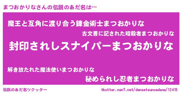 | 男性向けラノベタイトル風あだ名 | 『まつおかりな~年齢イコール彼女いない歴の魔法使い~』 |