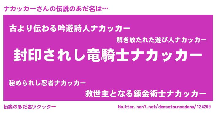 | 男性向けラノベタイトル風あだ名 | 『ナカッカーに滅ぼされるだけの簡単なお仕事です』 |