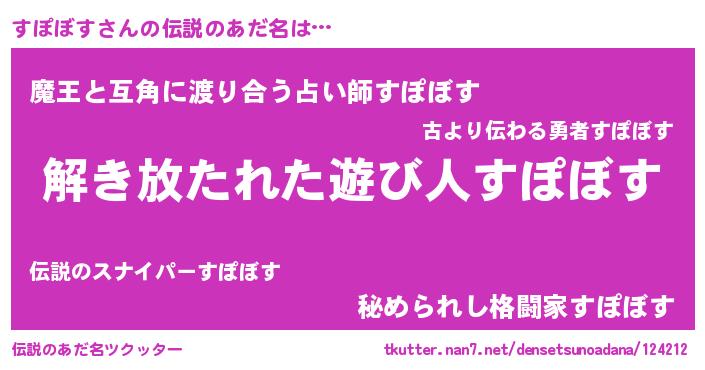 | 男性向けラノベタイトル風あだ名 | 『転生したらすぽぼすだった件』 |