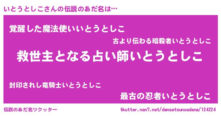 | 男性向けラノベタイトル風あだ名 | 『いとうとしこ~年齢イコール彼女いない歴の魔法使い~』 |