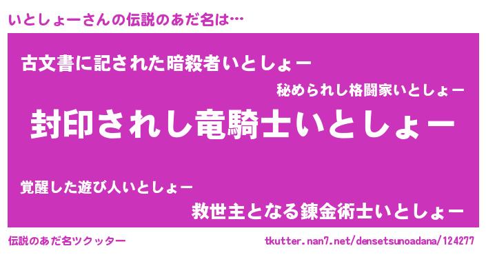 | 男性向けラノベタイトル風あだ名 | 『いとしょー~年齢イコール彼女いない歴の魔法使い~』 |