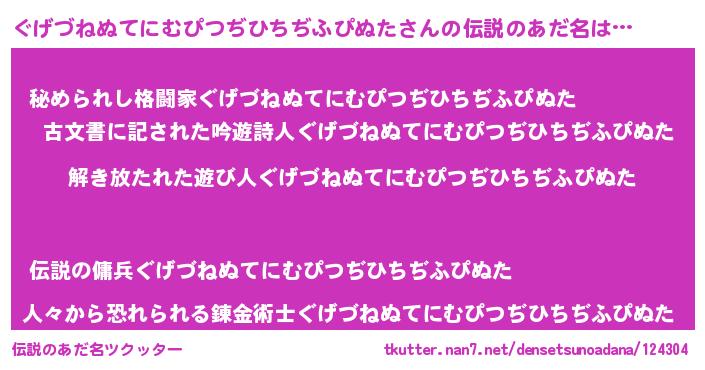 | 男性向けラノベタイトル風あだ名 | 『Re:ぐげづねぬてにむぴつぢひちぢふぴぬたから始める異世界生活』 |