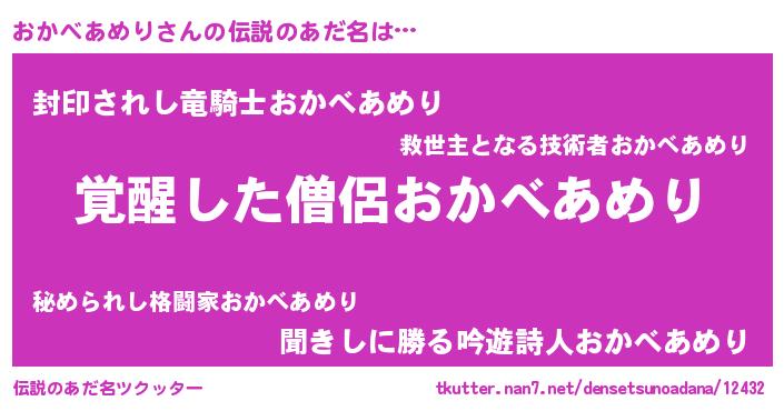 | 男性向けラノベタイトル風あだ名 | 『この素晴らしい世界におかべあめりを!』 |