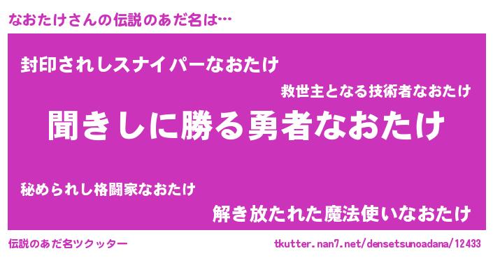 | 女子向けラノベタイトル風あだ名 | 『異世界で失敗しない100のなおたけ』 |