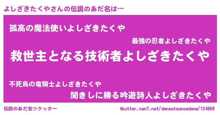 | 男性向けラノベタイトル風あだ名 | 『Re:よしざきたくやから始める異世界生活』 |