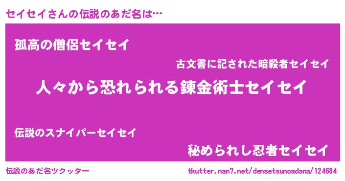 | ヒーロー風カッコイイあだ名 | 『超時空戦士セイセイ』『黄金騎士セイ』 |