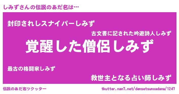| 意味不明あだ名 | 『とにかく怪しいしみず』『自称しみず』 |