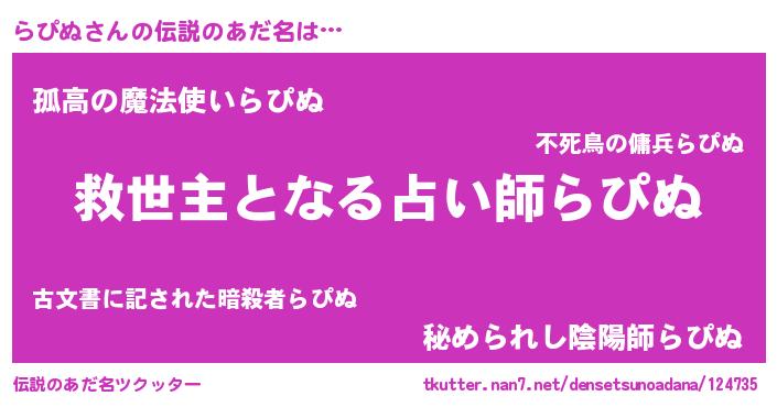 | 男性向けラノベタイトル風あだ名 | 『らぴぬ~年齢イコール彼女いない歴の魔法使い~』 |