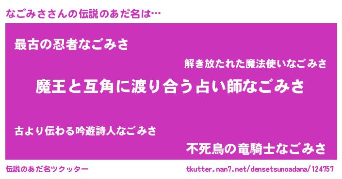 | ヒーロー風カッコイイあだ名 | 『友情の使者なごみさ』『幻影騎士ナゴ』 |