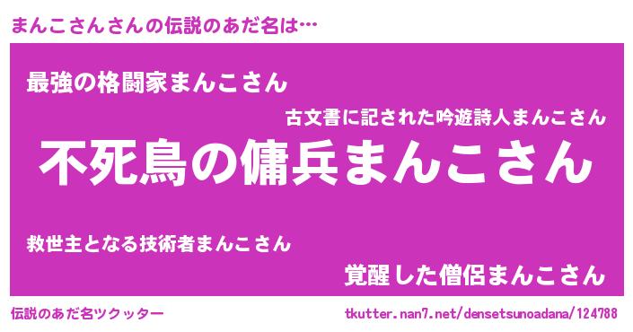 | 女子向けラノベタイトル風あだ名 | 『まんこさん姫と円卓の騎士』 |
