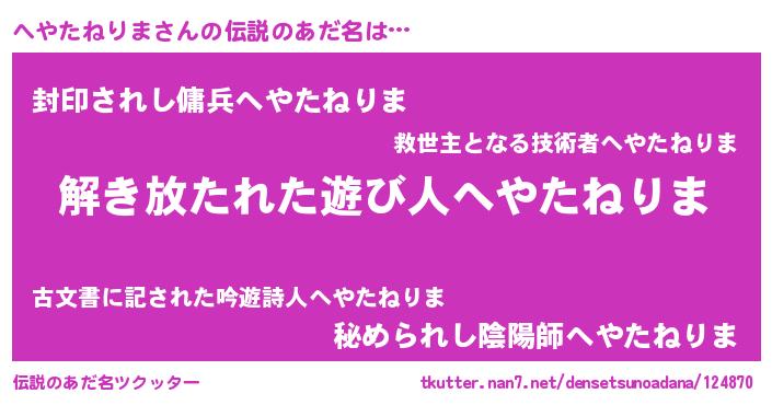 | 意味不明あだ名 | 『自称へやたねりま』 |