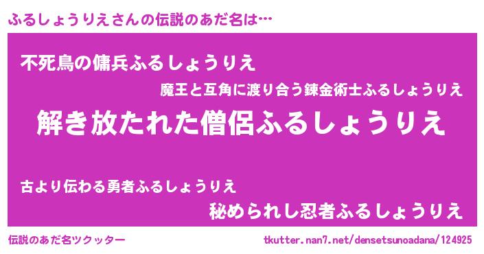 | 男性向けラノベタイトル風あだ名 | 『ふるしょうりえの嫁は女の子じゃないと思った?』 |