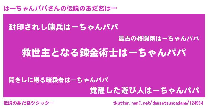 | 胡散臭い通販商品みたいなあだ名 | 『あなたにだけ特別に提供する世界で10本だけ現存している希少なブランデー…その名も「はーちゃんパパ」』 |