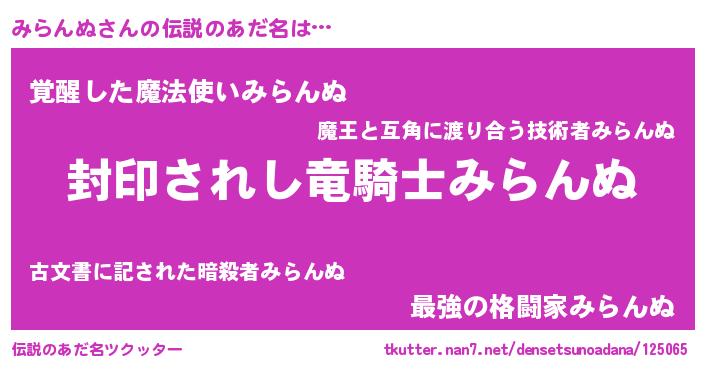 | 男性向けラノベタイトル風あだ名 | 『みらんぬ~年齢イコール彼女いない歴の魔法使い~』 |