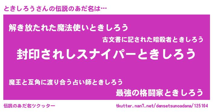 | 男性向けラノベタイトル風あだ名 | 『Re:ときしろうから始める異世界生活』 |