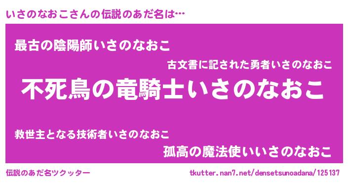 | 男性向けラノベタイトル風あだ名 | 『Re:いさのなおこから始める異世界生活』 |