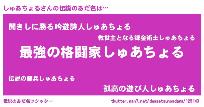| 意味不明あだ名 | 『しゅあちょるフォーエバー』 |