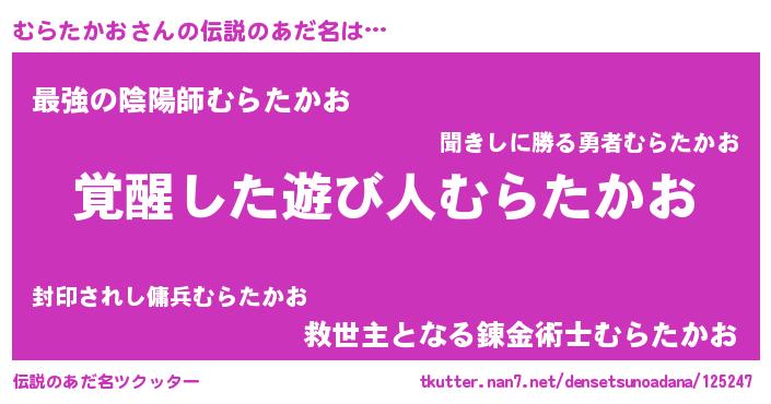 | ヒーロー風カッコイイあだ名 | 『天弓騎士ムラ』『最強戦士ムラタカオ』 |
