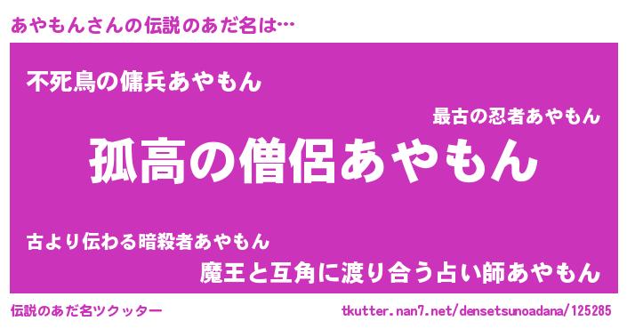 | 男性向けラノベタイトル風あだ名 | 『ダンジョンにあやもんを求めるのは間違っているだろうか』 |