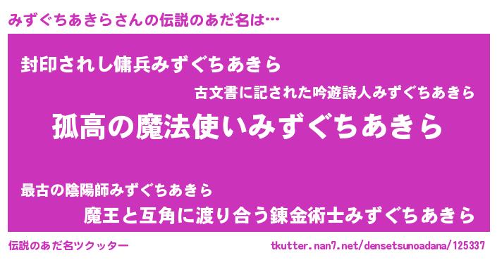 | 意味不明あだ名 | 『住所不定無職みずぐちあきら(6歳)』 |