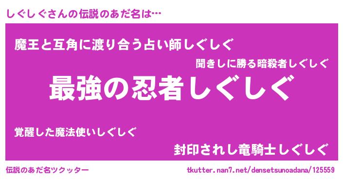 | 男性向けラノベタイトル風あだ名 | 『しぐしぐ~年齢イコール彼女いない歴の魔法使い~』 |