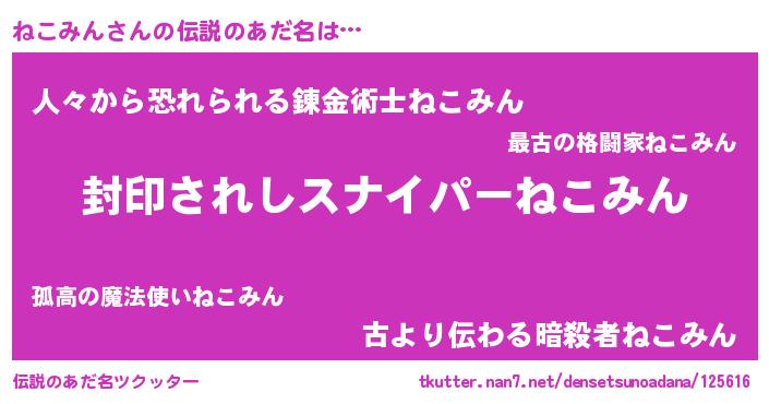 | ヒーロー風カッコイイあだ名 | 『スーパーネコミン』『愛の使者ねこみん』 |