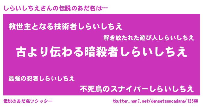 | 胡散臭い通販商品みたいなあだ名 | 『来世でも幸せになれる健康食品…その名も「しらいしちえ」』 |