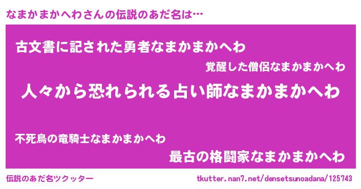 | 意味不明あだ名 | 『自称なまかまかへわ』 |