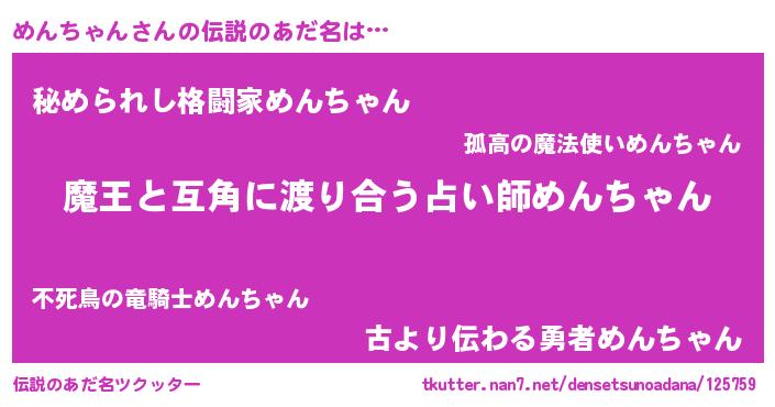 | 男性向けラノベタイトル風あだ名 | 『転生したらめんちゃんだった件』 |