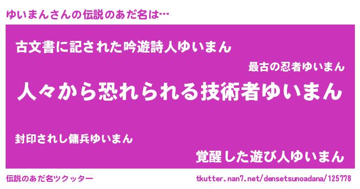 | 男性向けラノベタイトル風あだ名 | 『おまえをオタクにしてやるから、俺をゆいまんにしてくれ! 』 |