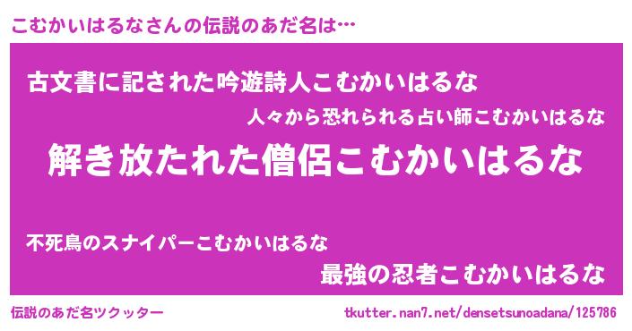 | 男性向けラノベタイトル風あだ名 | 『こむかいはるなの嫁は女の子じゃないと思った?』 |
