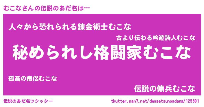 | 男性向けラノベタイトル風あだ名 | 『やはりむこなの青春ラブコメはまちがっている 』 |