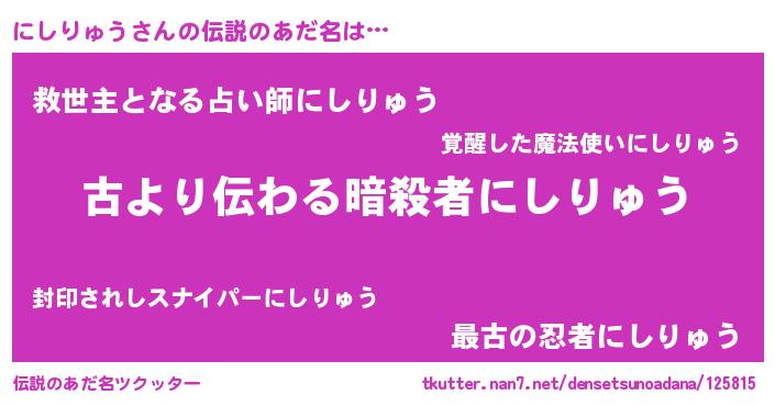| ヒーロー風カッコイイあだ名 | 『ネオニシリュウ』『愛の使者にしりゅう』 |