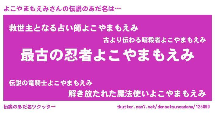 | 女子向けラノベタイトル風あだ名 | 『乙女ゲームの破滅フラグしかない悪役よこやまもえみに転生してしまった…』 |